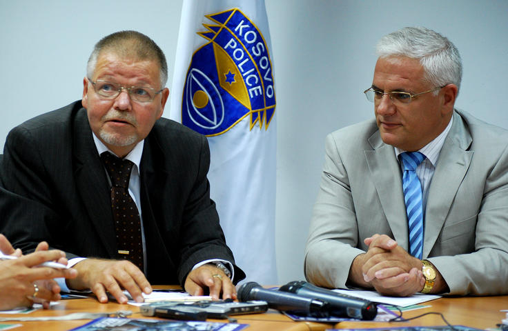 Deputy Head of the OSCE Mission in Kosovo Markku Laamanen (l) and Adem Grabovci, Kosovo's Deputy Minister of Transport and Telecommunications, at a press conference to announce the launch of a road traffic safety campaign, Pristina, 25 July 2008.