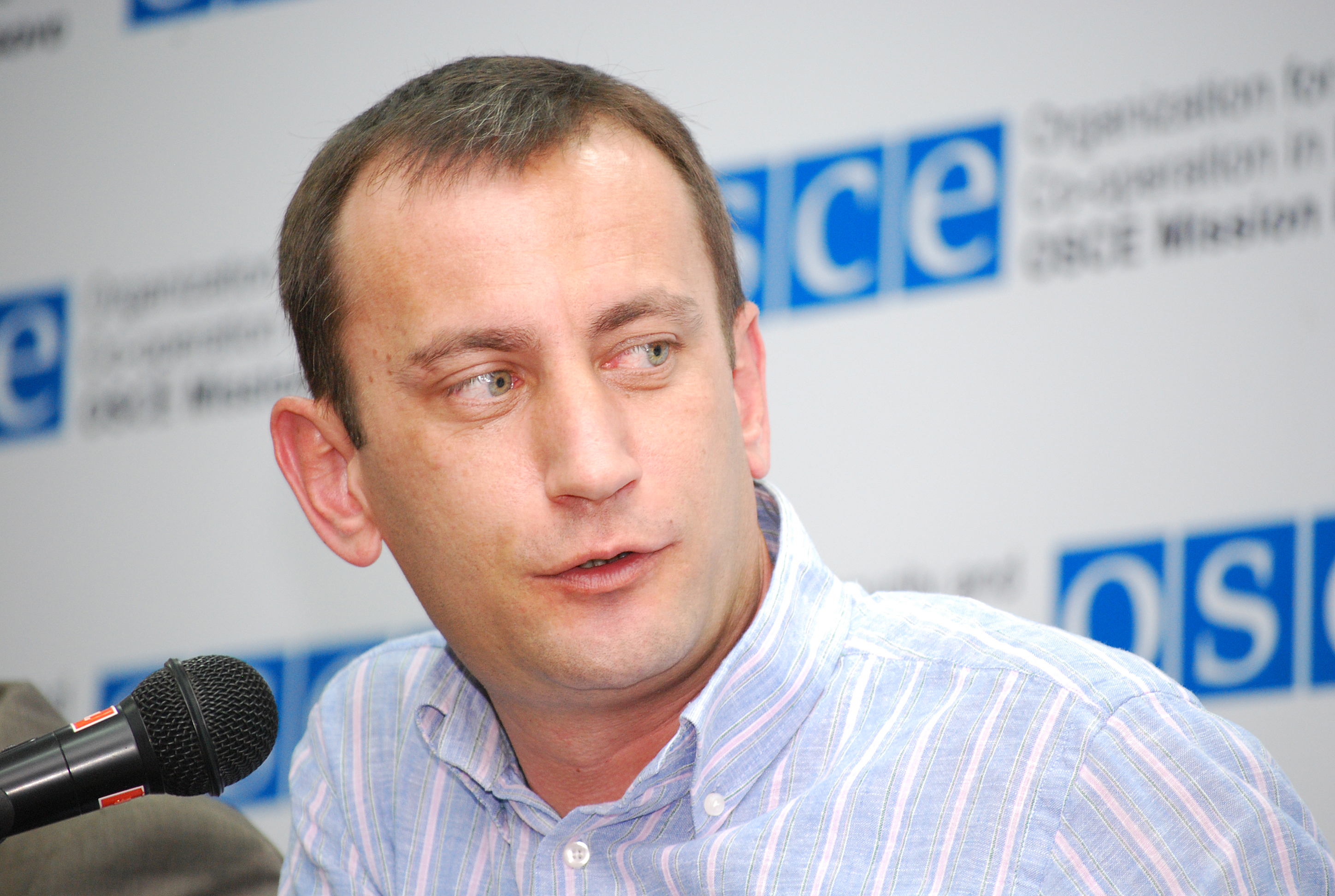 Arthur Marku, Chief of Terres des Hommes in Kosovo, talks to the media at the launch of a campaign to combat child trafficking and begging, sponsored by the OSCE Mission in Kosovo, Prishtine/Pristina, 7 August 2008.