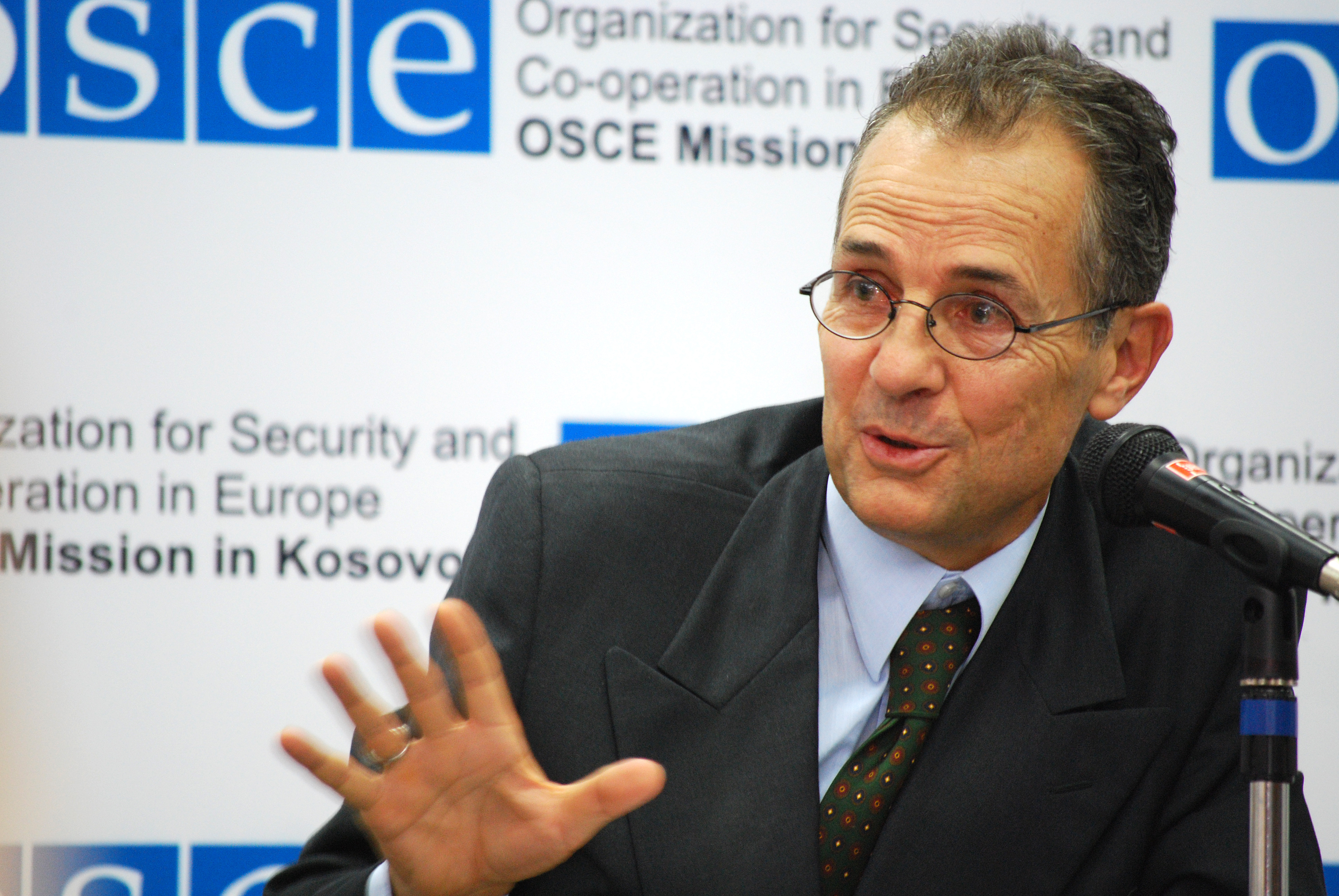 Head of the OSCE Mission in Kosovo, Ambassador Tim Guldimann, presents an OSCE report assessing human rights, ethnic relations and democracy in Kosovo to the media at a press conference, Prishtine/Pristina, 8 September 2008.