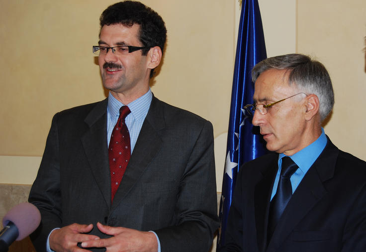 The Head of OSCE Mission in Kosovo, Ambassador Werner Almhofer (left), and the President of the Kosovo Assembly, Jakup Krasniqi, talk to the media after their meeting, 3 October 2008.