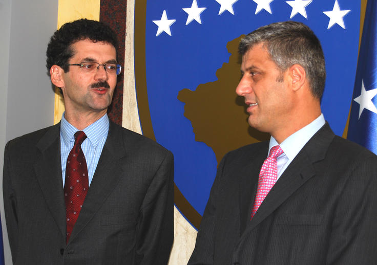 The Head of the OSCE Mission in Kosovo, Ambassador Werner Almhofer (left), and the Prime Minister of Kosovo, Hashim Thaci, talk to the media after their meeting, 3 October 2008.