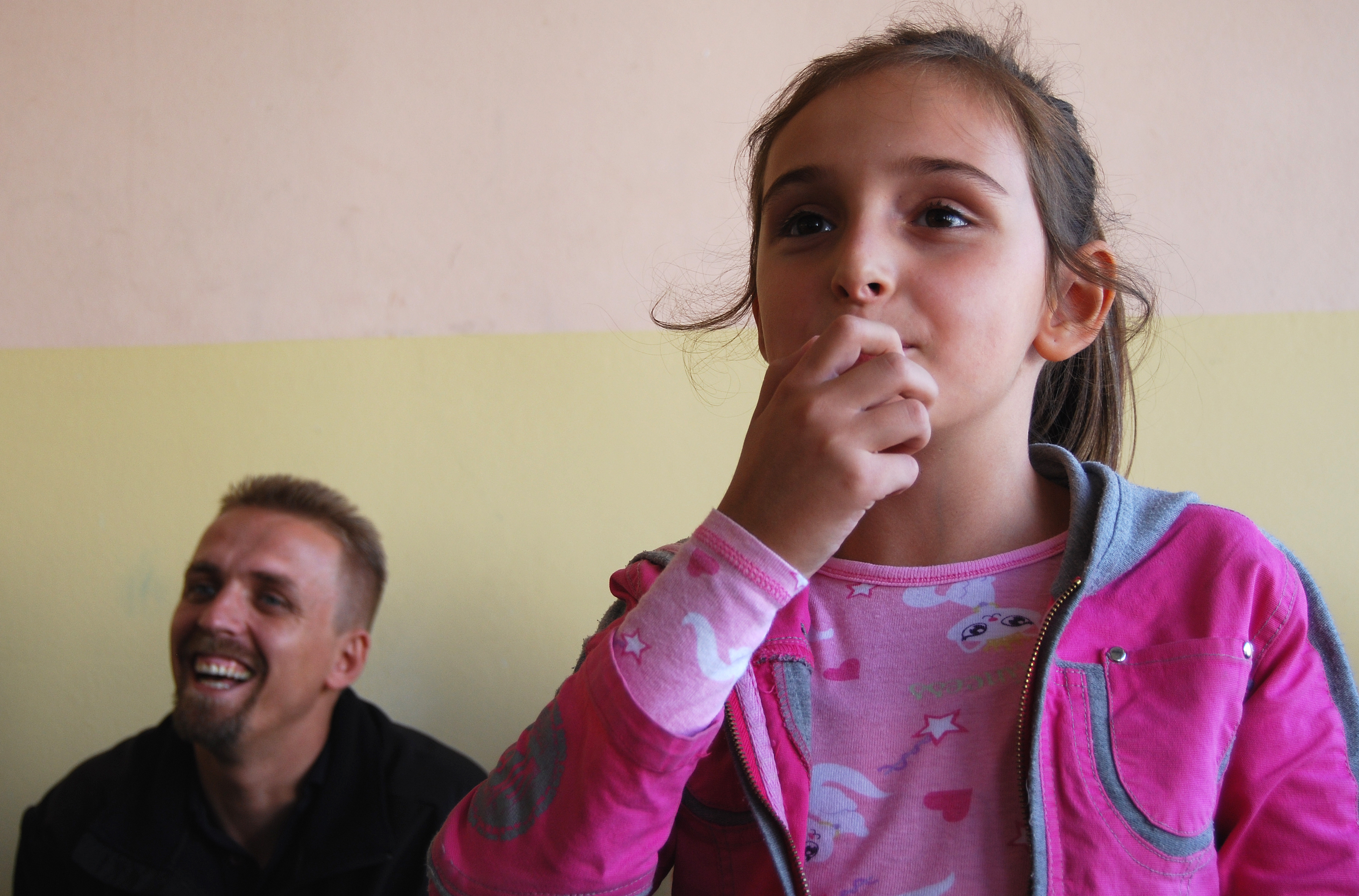 Lisa Beqiri, from the 'Dardania' primary school, calls firefighters as part of an exercise during an OSCE project on fire protection education, to be implemented in five primary schools in the Prishtine/Pristina region, 10 October 2008.