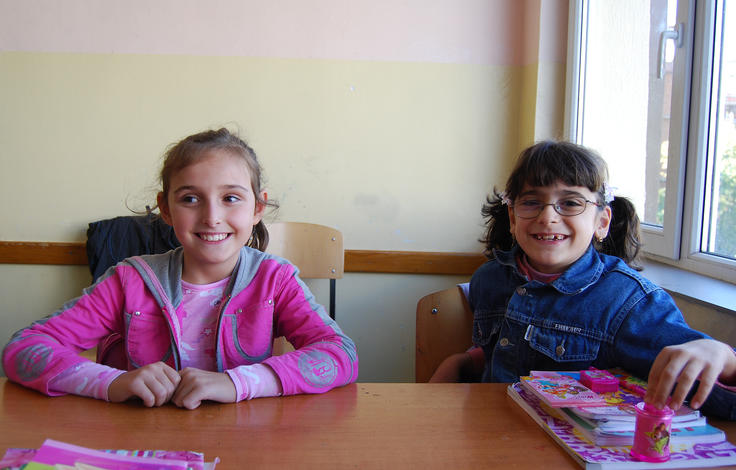 Lisa Beqiri (left) and a classmate from the 'Dardania' primary school at an OSCE project on fire protection education, a pilot project to be implemented in five primary schools in the Prishtine/Pristina region, 10 October 2008.