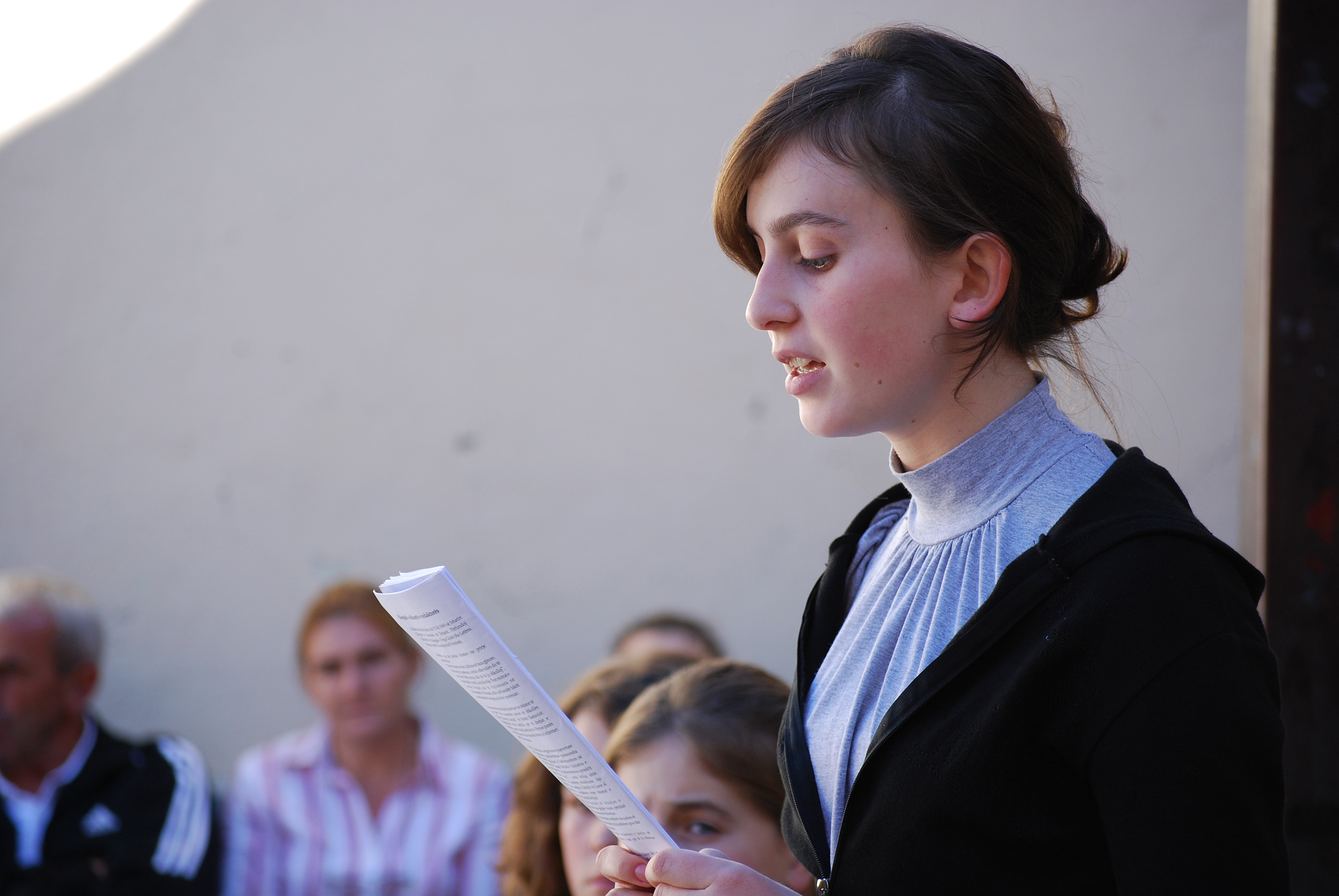 Liridona Mehmetaj, a student at the Rexhep Kadrijaj primary school in Rastavice/Rastavica village, reads her poem at the presentation of the anthology of poems 'Shpresa' (Hope), Junik, Kosovo, 3 November 2008.