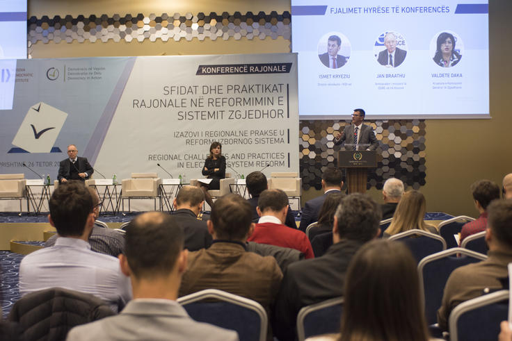 Head of the OSCE Mission in Kosovo, Ambassador Jan Braathu, addresses a conference on regional challenges and practices in electoral system reform, organized by the Kosovo Democratic Institute. Prishtinë/Priština, 26 October 2018.