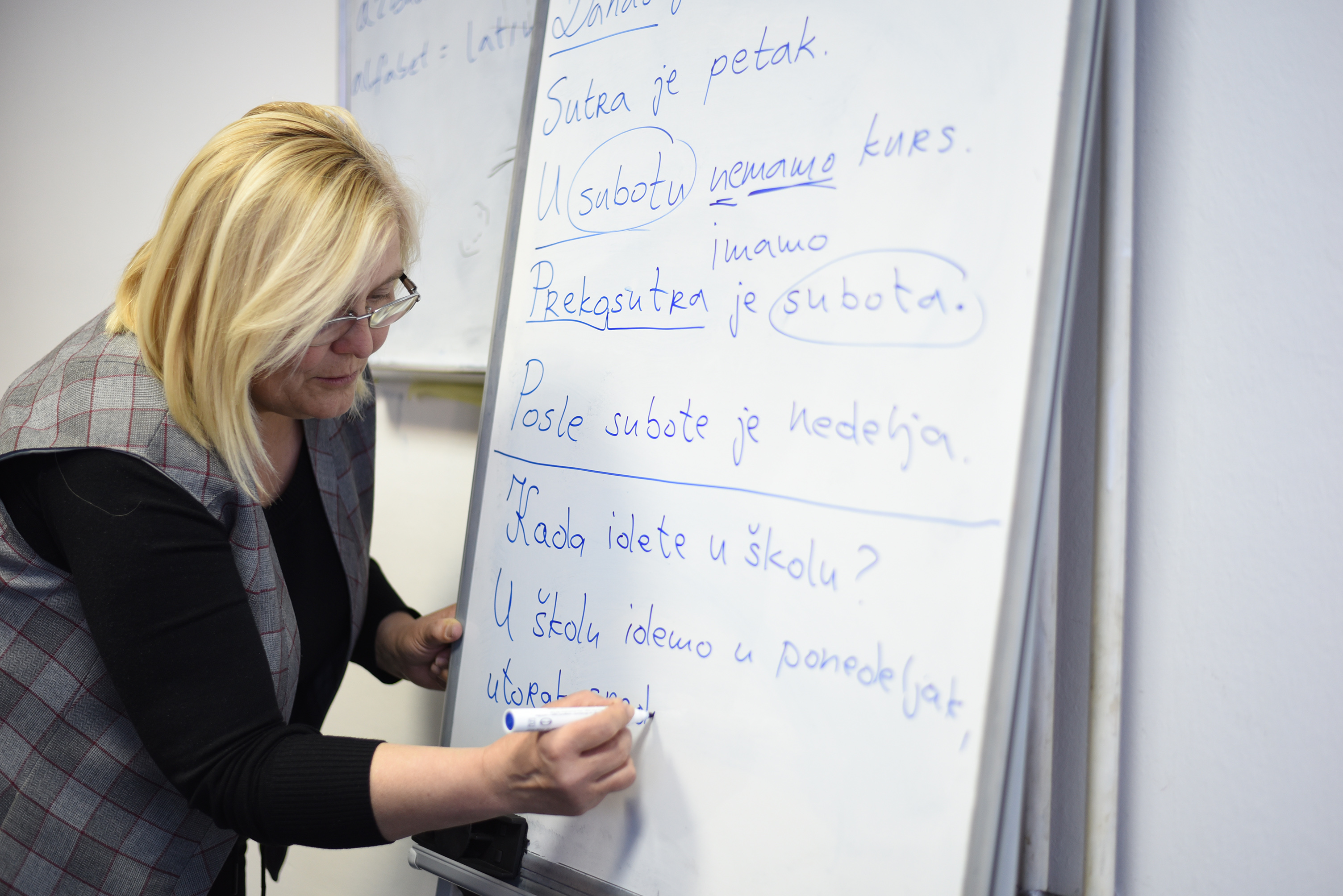 A teacher explains days of the week to Kosovo Albanian students during OSCE Mission in Kosovo-organized Serbian language classes, Obiliq/Obilić, 28 March 2019.