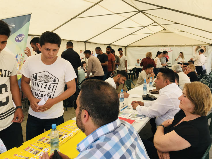Visitors receiving information during the OSCE Mission in Kosovo organized employment fair, Pejë/Peć, 11 June 2019.
