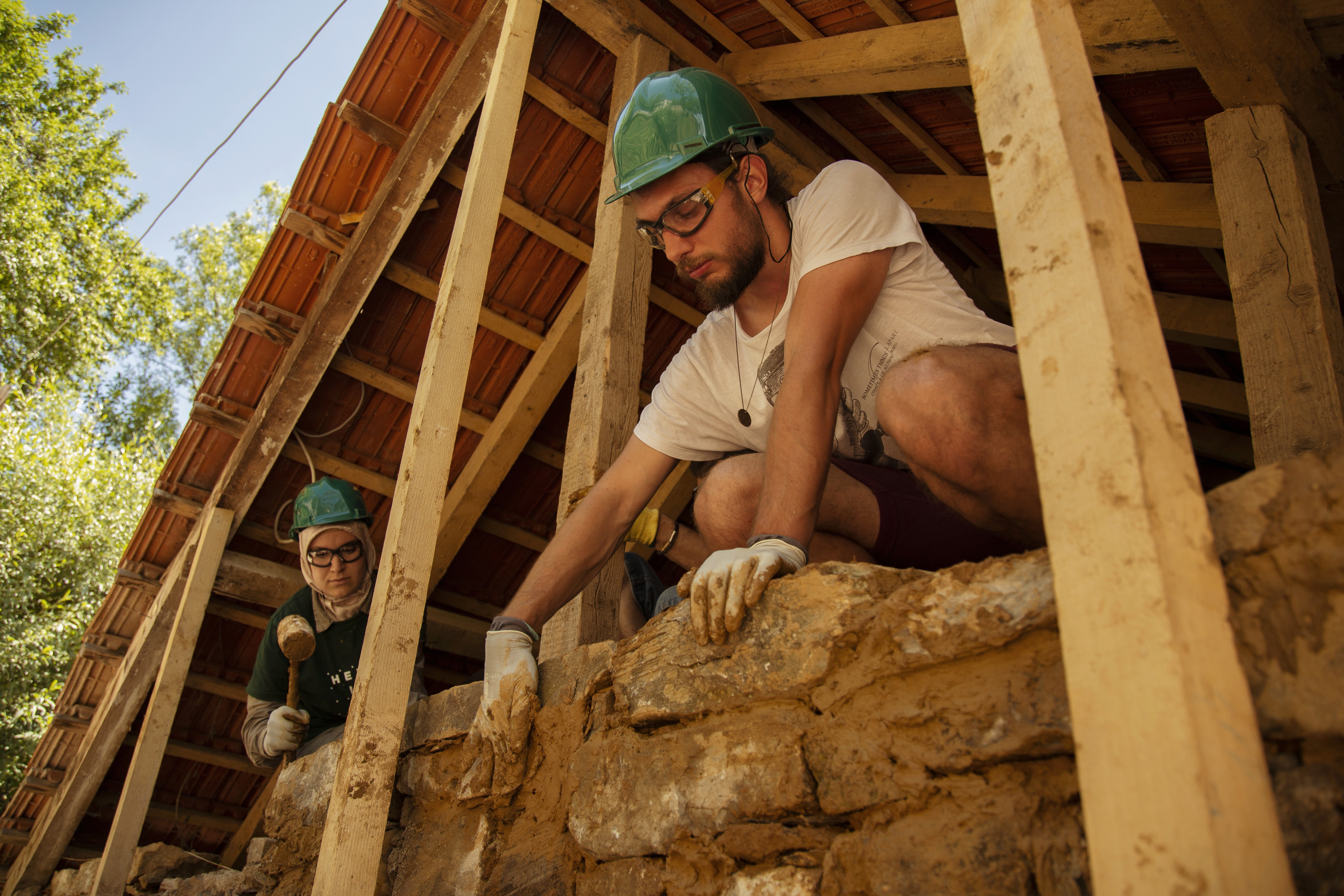 Participants of the cultural heritage camp organized by the OSCE Mission in Kosovo work on rebuilding the outer wall of the 19th century mill, Letnicë/Letnica, 26 June 2019