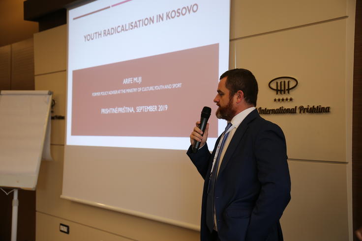 Aonghus Kelly, a legal consultant, leads a workshop on preventing youth radicalization in Kosovo, 23 September 2019.