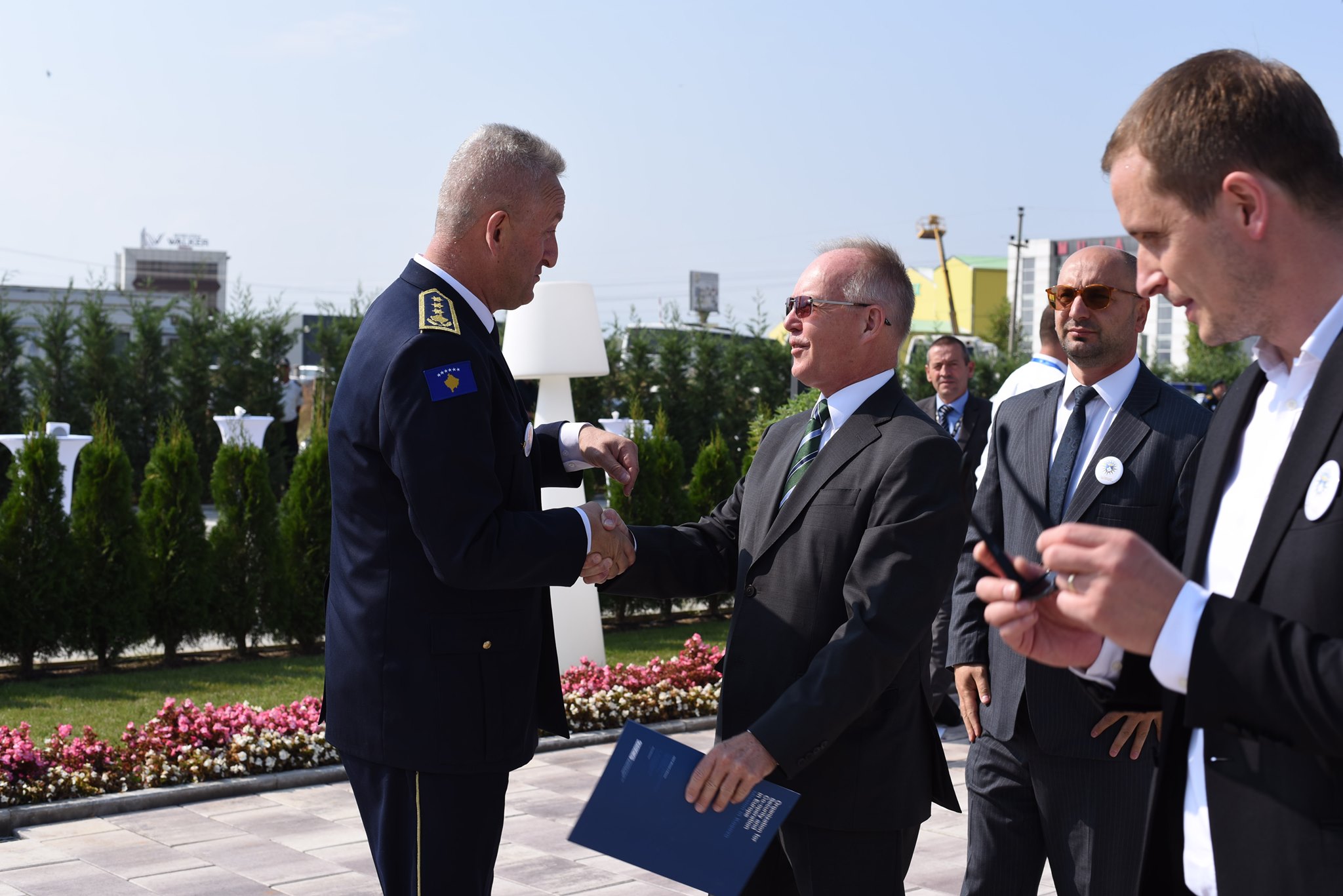 Jan Braathu, The Head of the OSCE Mission in Kosovo, attends the 20th anniversary of the Kosovo Police and receives an appreciation plaque in recognition of OSCE support throughout the years, awarded by Rashit Qalaj, the General Director of Kosovo Police, Vushtrri/Vučitrn, 6 September 2019.
