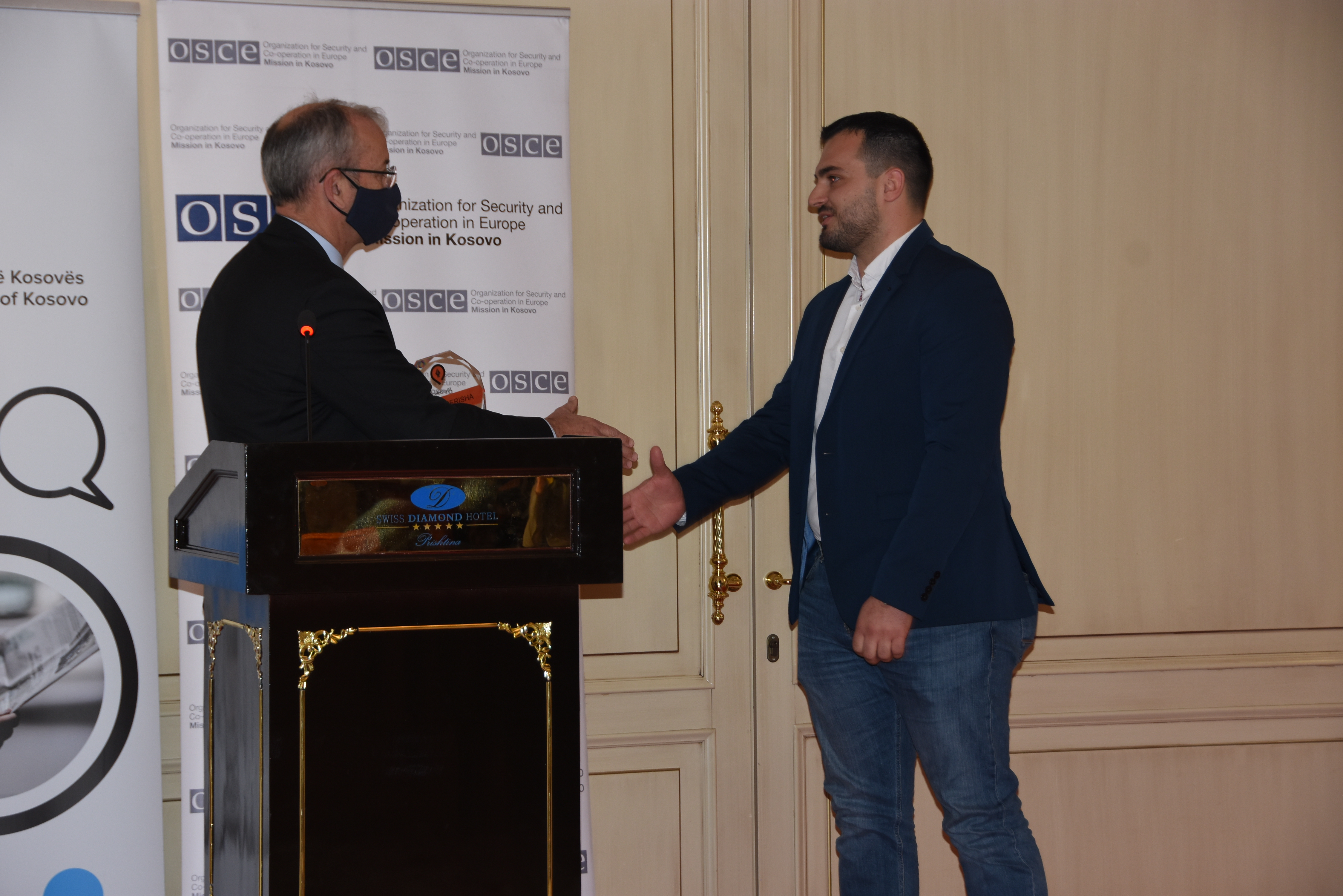 A professional jury evaluated the applications open to journalists from all communities in Kosovo and the Head of the OSCE Mission, Ambassador Michael Davenport, presented the Journalist of the Year Award to Kastriot Berisha in a ceremony held on 23 December 2021.