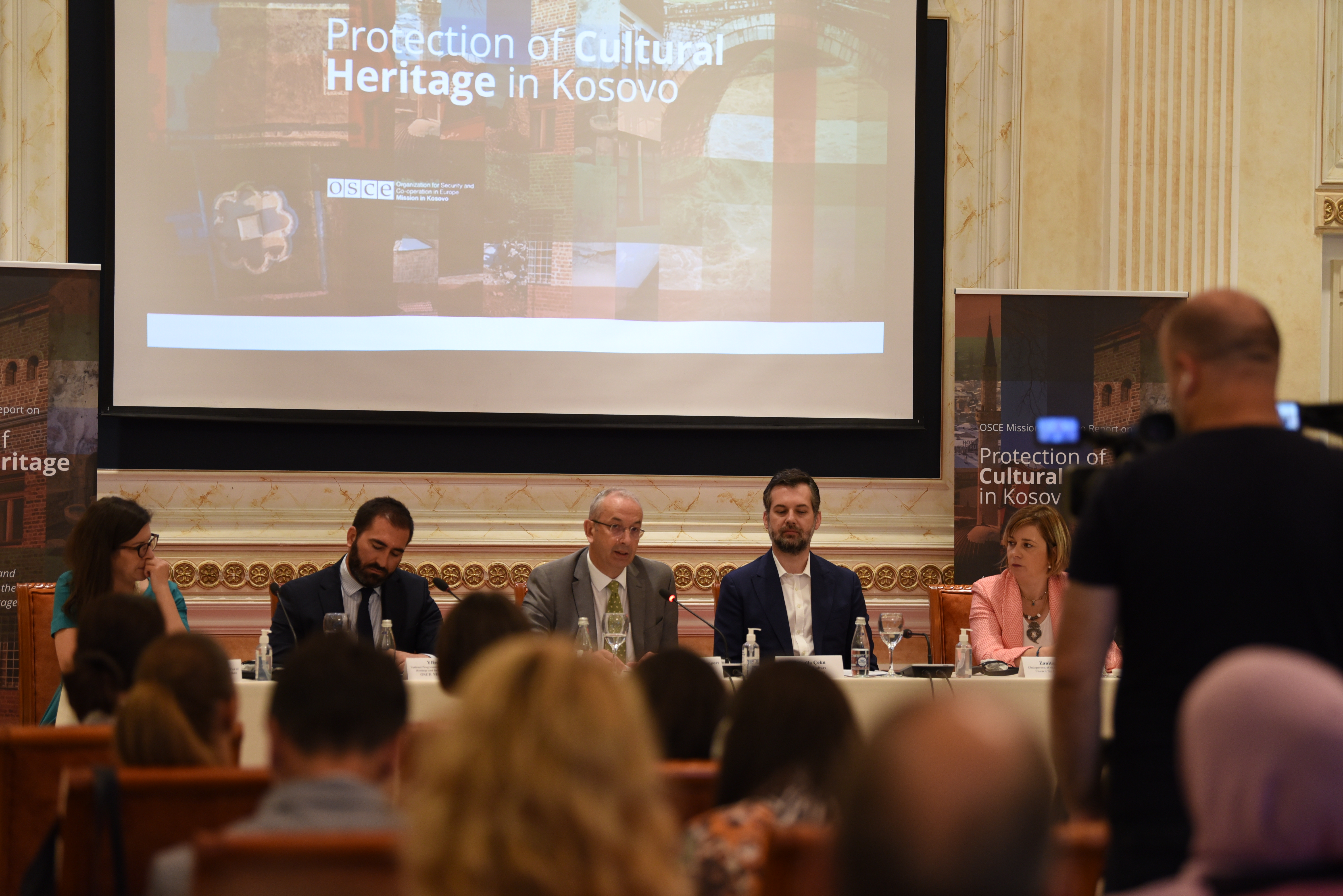 Head of the OSCE Mission in Kosovo, Ambassador Michael Davenport, and Minister of Culture, Youth and Sport Hajrulla Çeku, giving the opening remarks at the launching of the report on Protection of Cultural Heritage in Kosovo, Prishtinë/Priština, 18 July 2022.