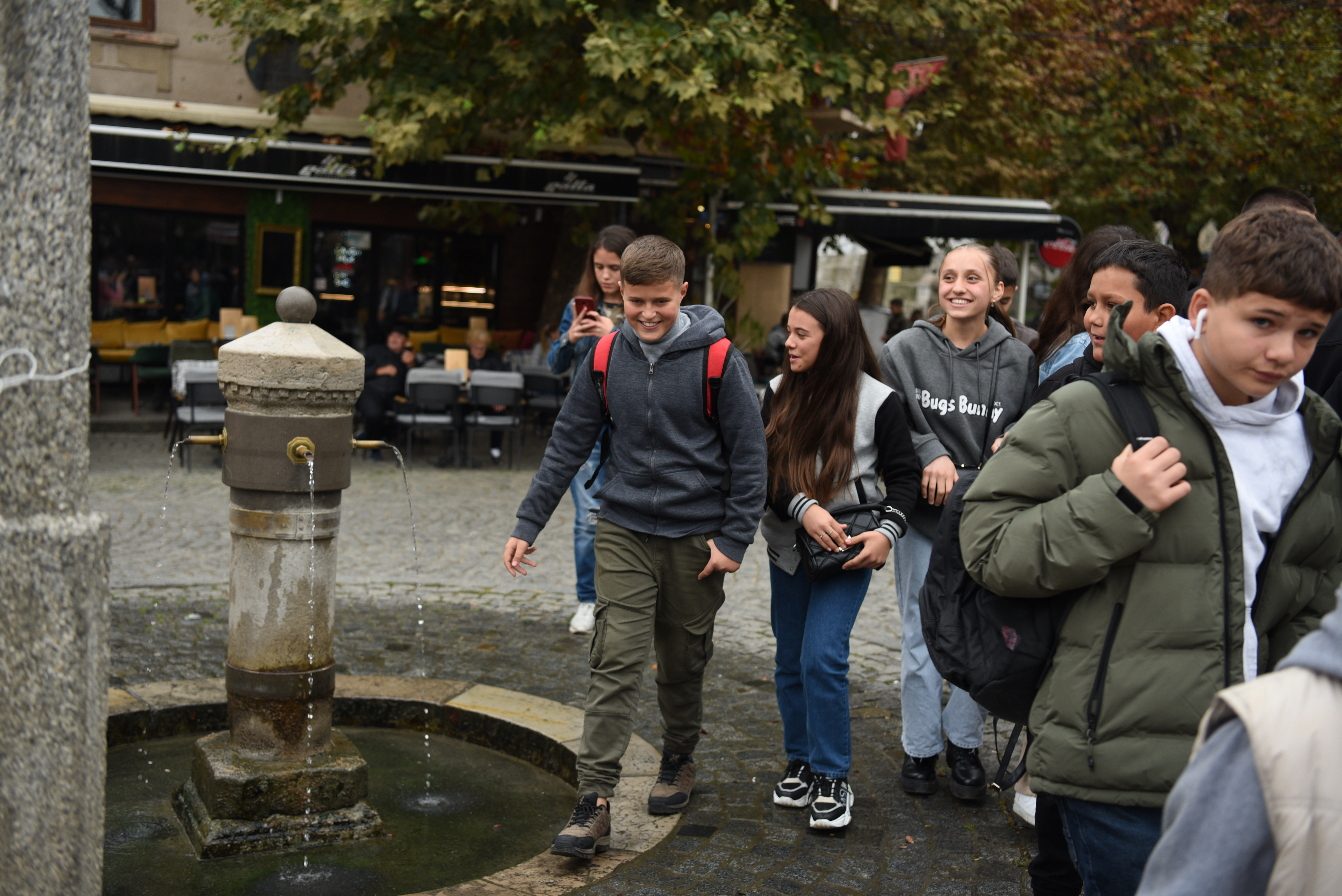 Pupils of Ismail Luma Primary School from Lipjan/Lipljan walk by the Shadërvan/Šadrvan fountain during an OSCE Mission in Kosovo supported visit to cultural and religious heritage sites in Prizren, 10 November 2022.