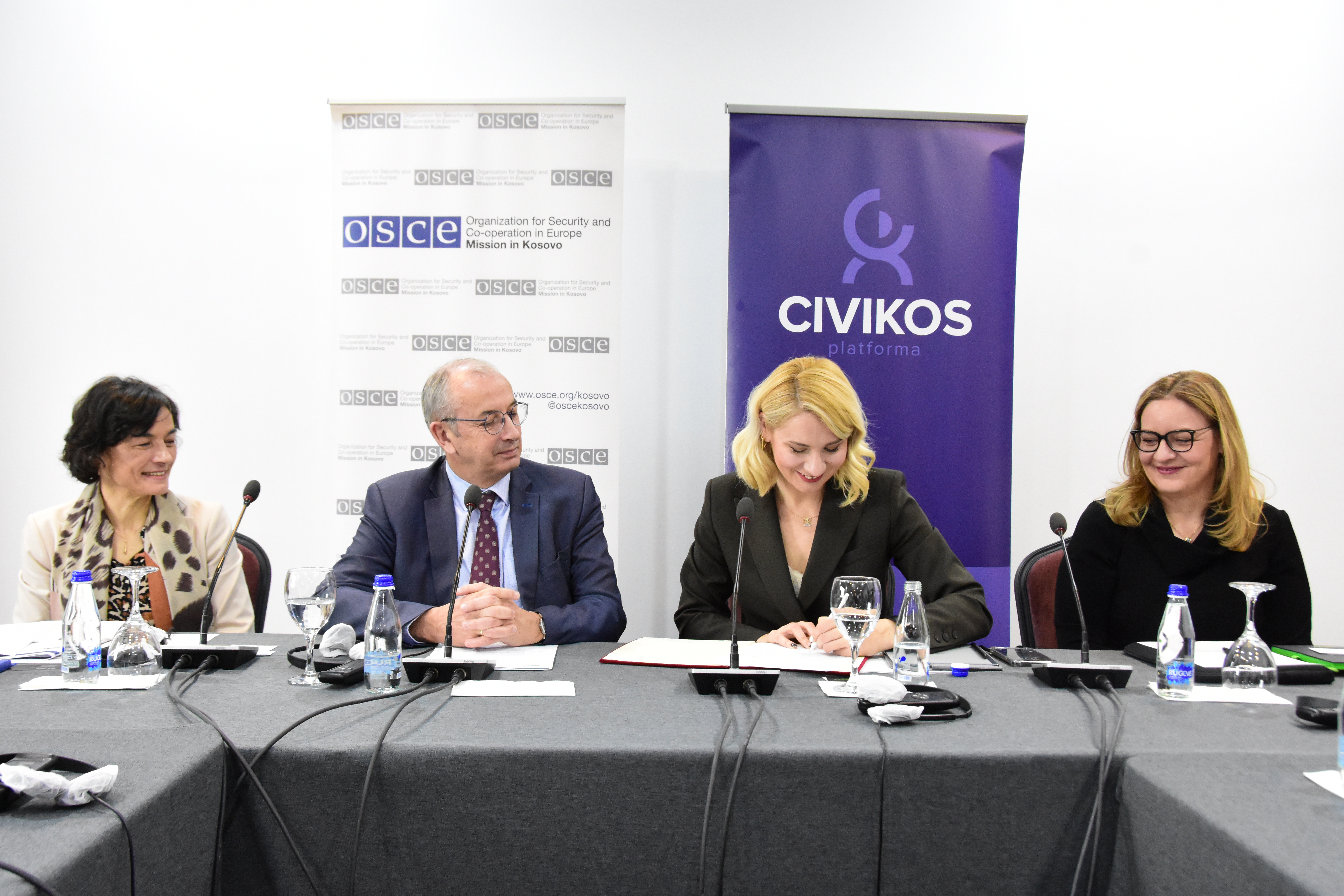 Donika Emini, Executive Director of Platforma CiviKos, takes the ownership of Kosovo Funding Portal, handed over by the OSCE Mission in Kosovo, Prishtinë/Priština, 01 March 2023.