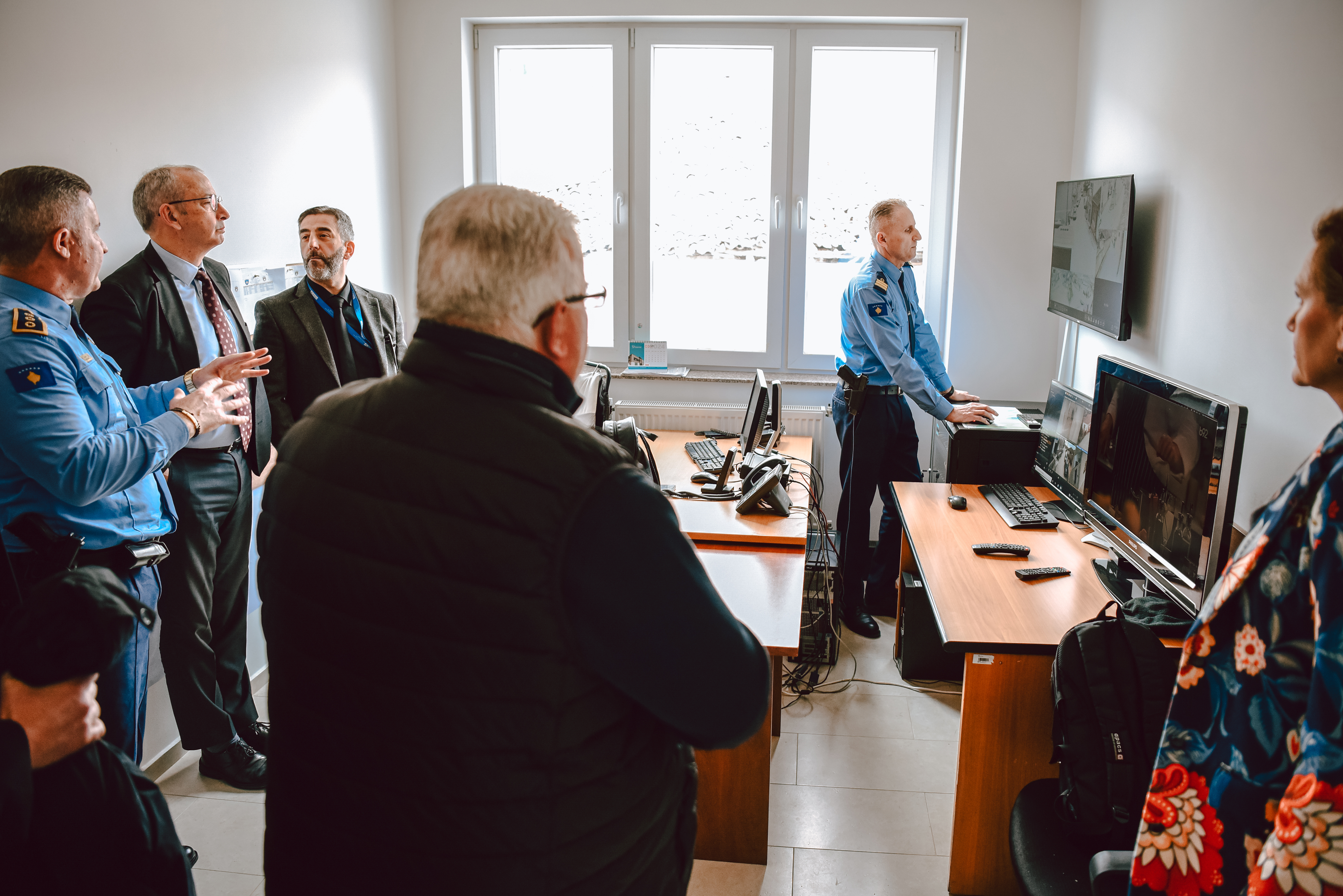 Ambassador Davenport visits the CCTV cameras monitoring room in Janjevë/Janjevo sub-station, 04 March 2024.