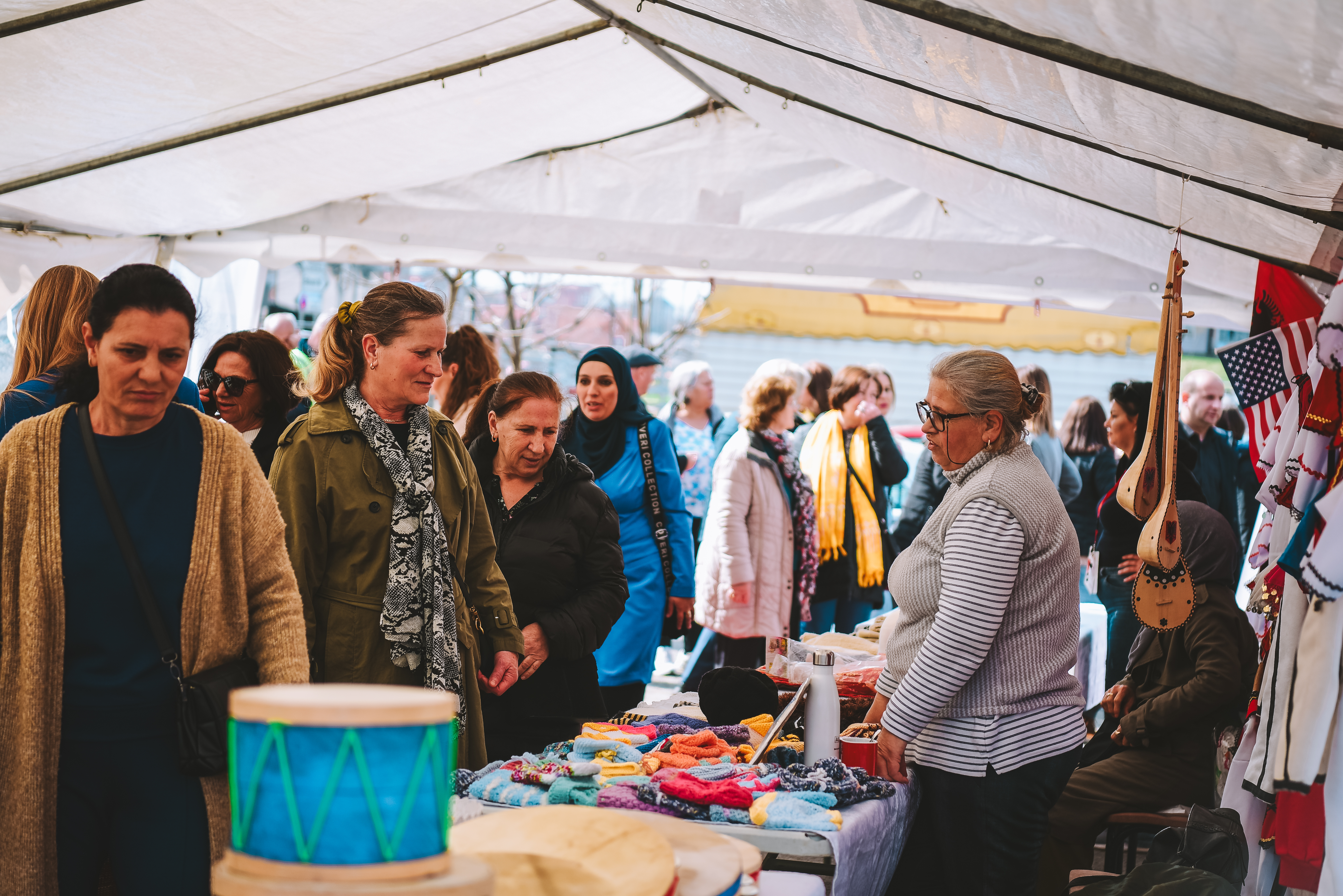 Visitors and members of Lipjan/Lipljan and Obiliq/Obilić Local Women Caucus members check out products displayed at the fair.