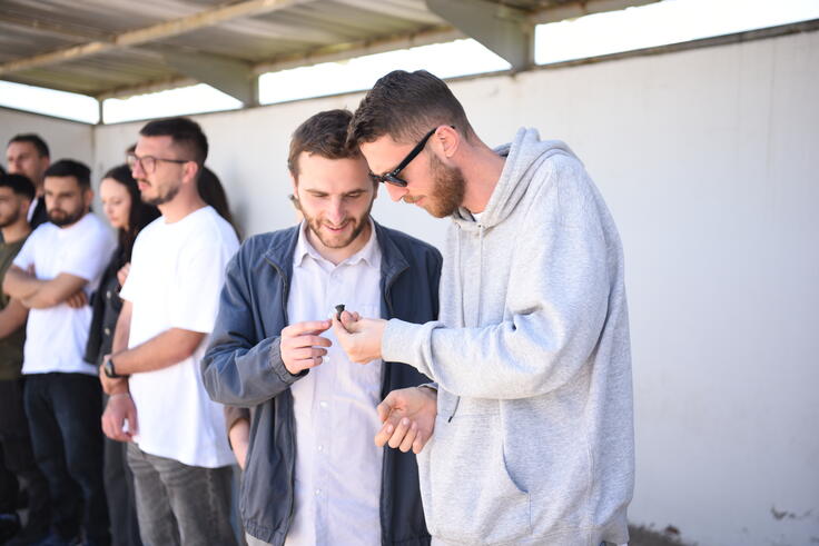 Two media workers closely analyze a rubber bullet. Lipjan/Lipljan, 29 April 2024