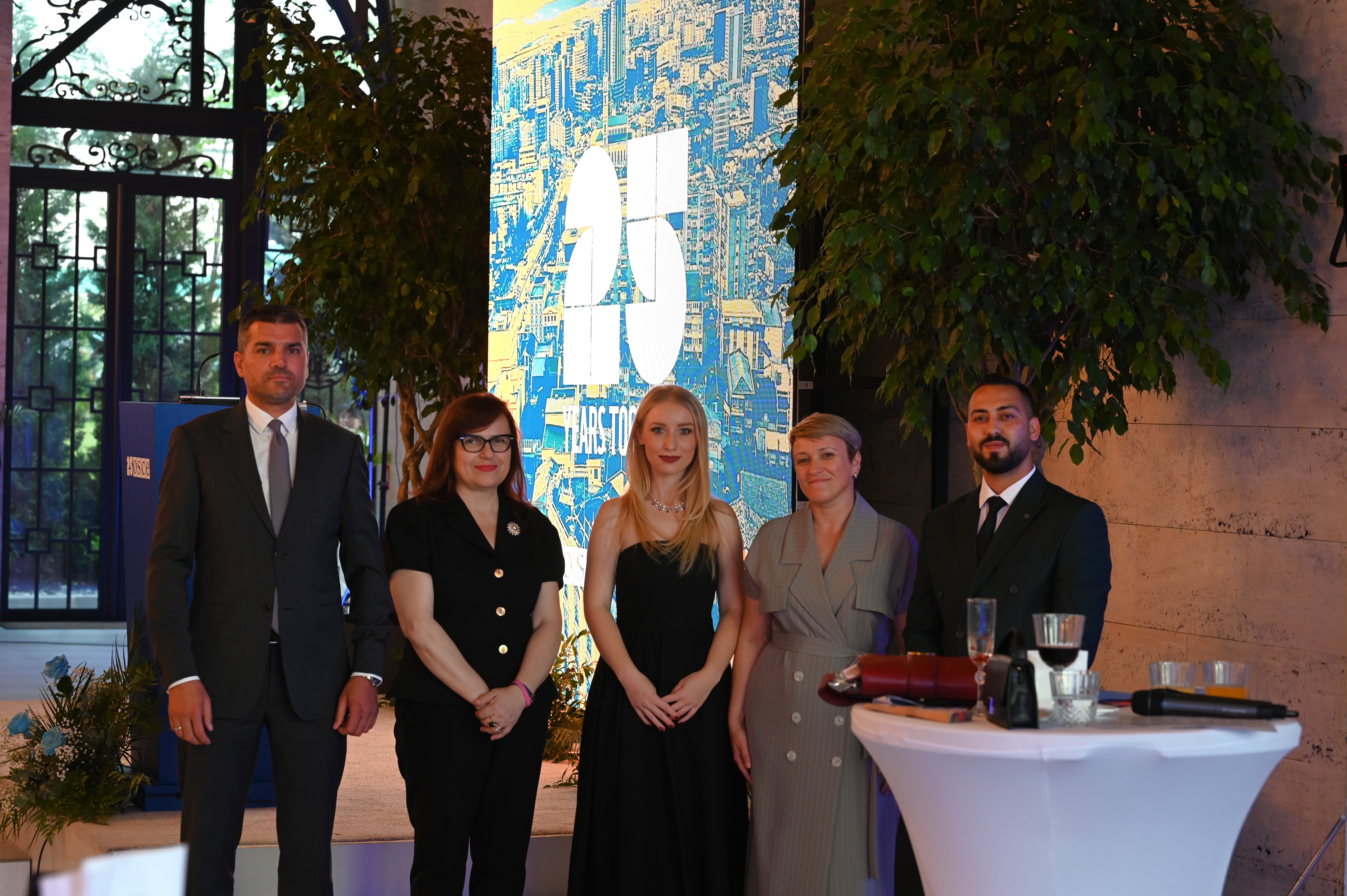 Guest speakers at the reception celebrating the 25th anniversary of the OSCE Mission in Kosovo. From left: Srdjan Sentić, Deputy Ombudsperson, Lindita Sejdiu-Rugova, Dean of the Philological Faculty at the University of Prishtina, Jelena Bulatović, Director of NGO Centre for Minority Communities in Gračanica/Gracanicë, Dashurie Ahmeti, Head of the Youth Sector in Ferizaj/Uroševac municipality, and Fatmir Menekshe, Head of the Durmish Aslano NGO and Director of Radio Romano Avazo, 25 June 2024.