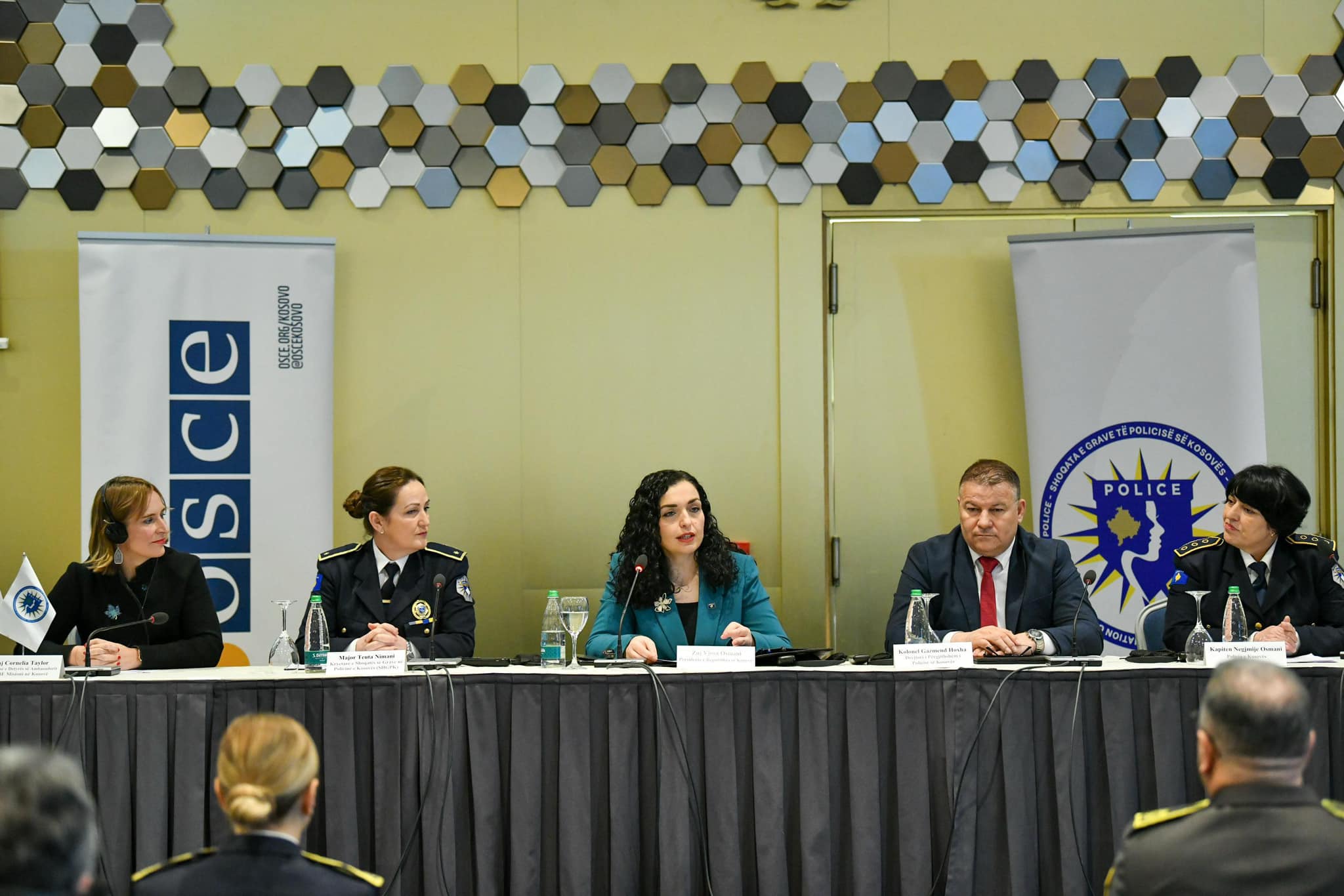 President Vjosa Osmani-Sadriu addressing participants at the conference 'Women in Policing – Implementing Gender-Transformative Measures to Empower Women in the Police' supported by OSCE Mission in Kosovo, Prishtinë/Priština, 7 March 2025.