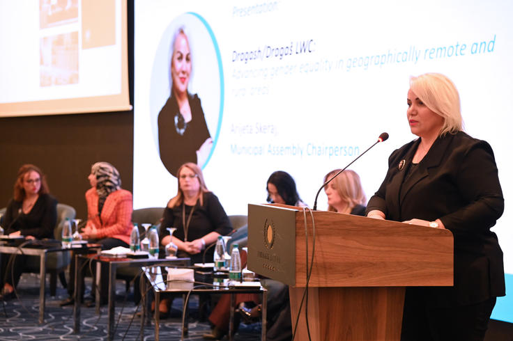 Arijeta Qafleshi Skeraj, Chairwoman of the Dragash/Dragaš Municipal Assembly, presents the Local Women Caucuses impactful initiatives at the LWCs Transforming Communities conference. Prishtinë/Priština, November 2024. (OSCE/Fitim Xharra)