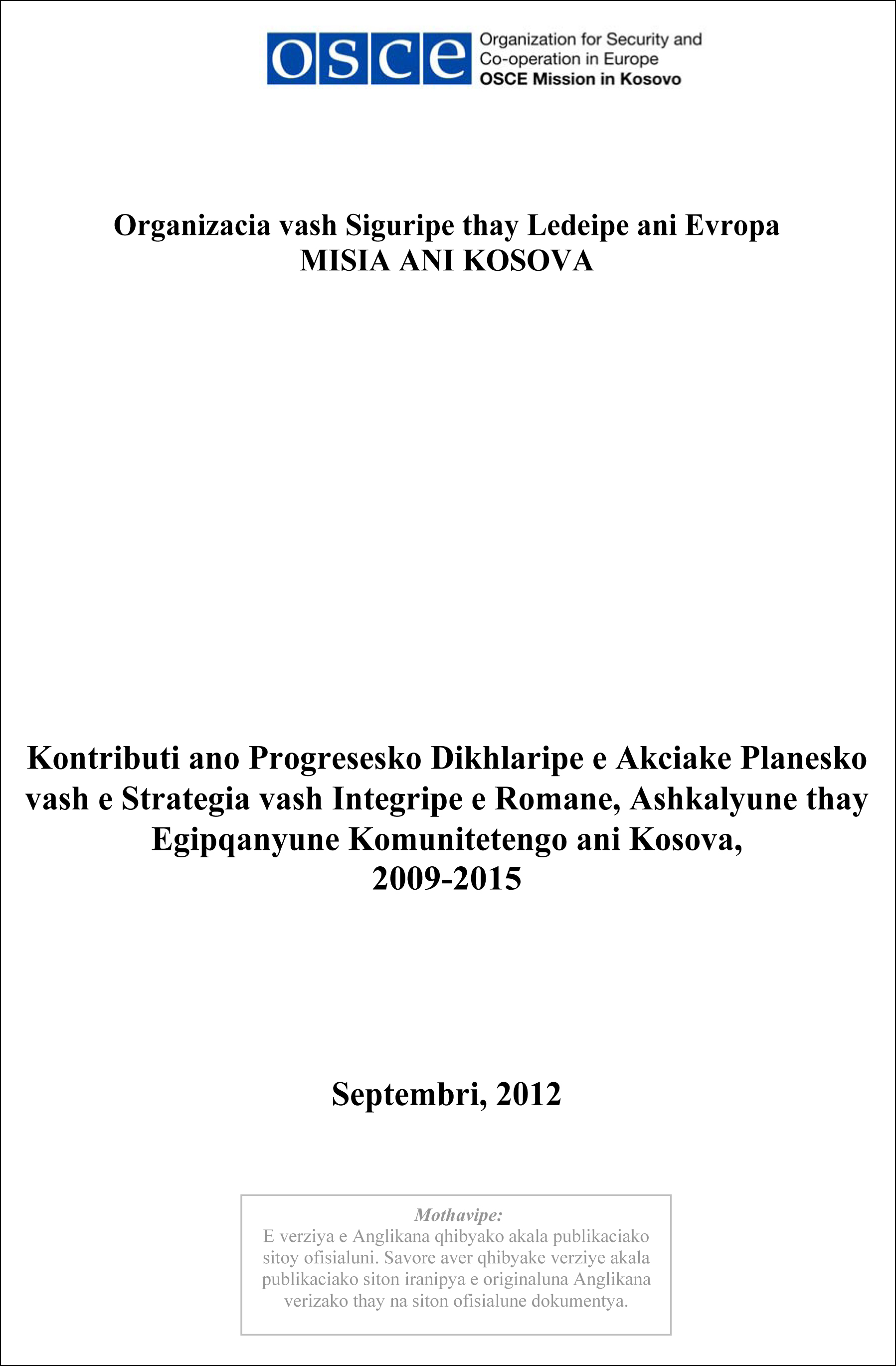 Kontributi ano Progresesko Dikhlaripe e Akciake Planesko vash e Strategia vash Integripe e Romane, Ashkalyune thay Egipqanyune Komunitetengo ani Kosova, 2009-2015.