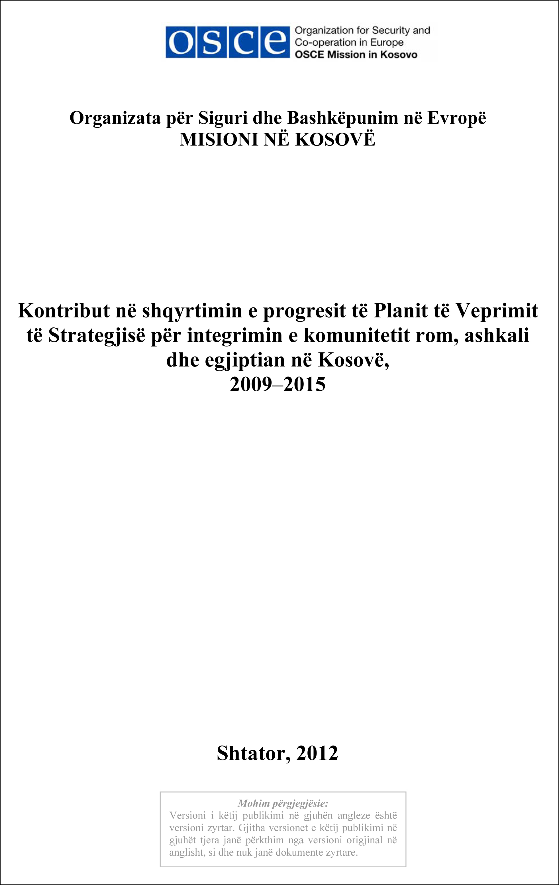 Kontribut në shqyrtimin e progresit të Planit të Veprimit të Strategjisë për integrimin e komunitetit rom, ashkali dhe egjiptian në Kosovë, 2009–2015.