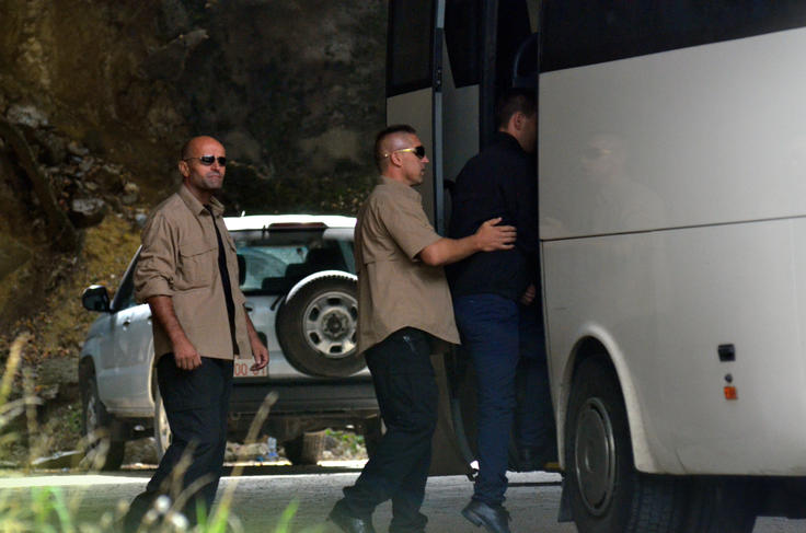 Pjesëtarët e Njësisë për Mbrojtje të Afërt të Policisë së Kosovës ushtrojnë transferimin e të burgosurve gjatë trajnimit të ofruar nga Misioni i OSBE-së, Lipjan, 22 gusht 2014.