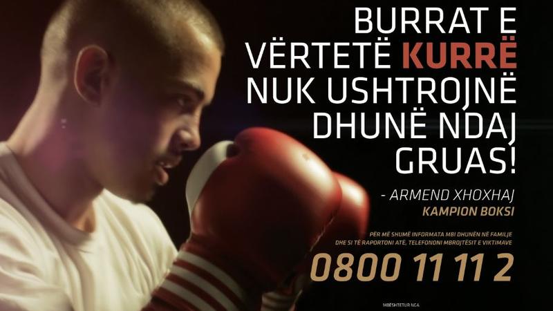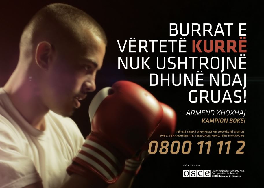 Posteri i fushatës së OSBE-së kundër dhunës ndaj grave. “Burrat e vërtetë kurrë nuk ushtrojnë dhunë ndaj gruas” ka qenë porosia e kampionit të boksit Armend Xhoxhaj.