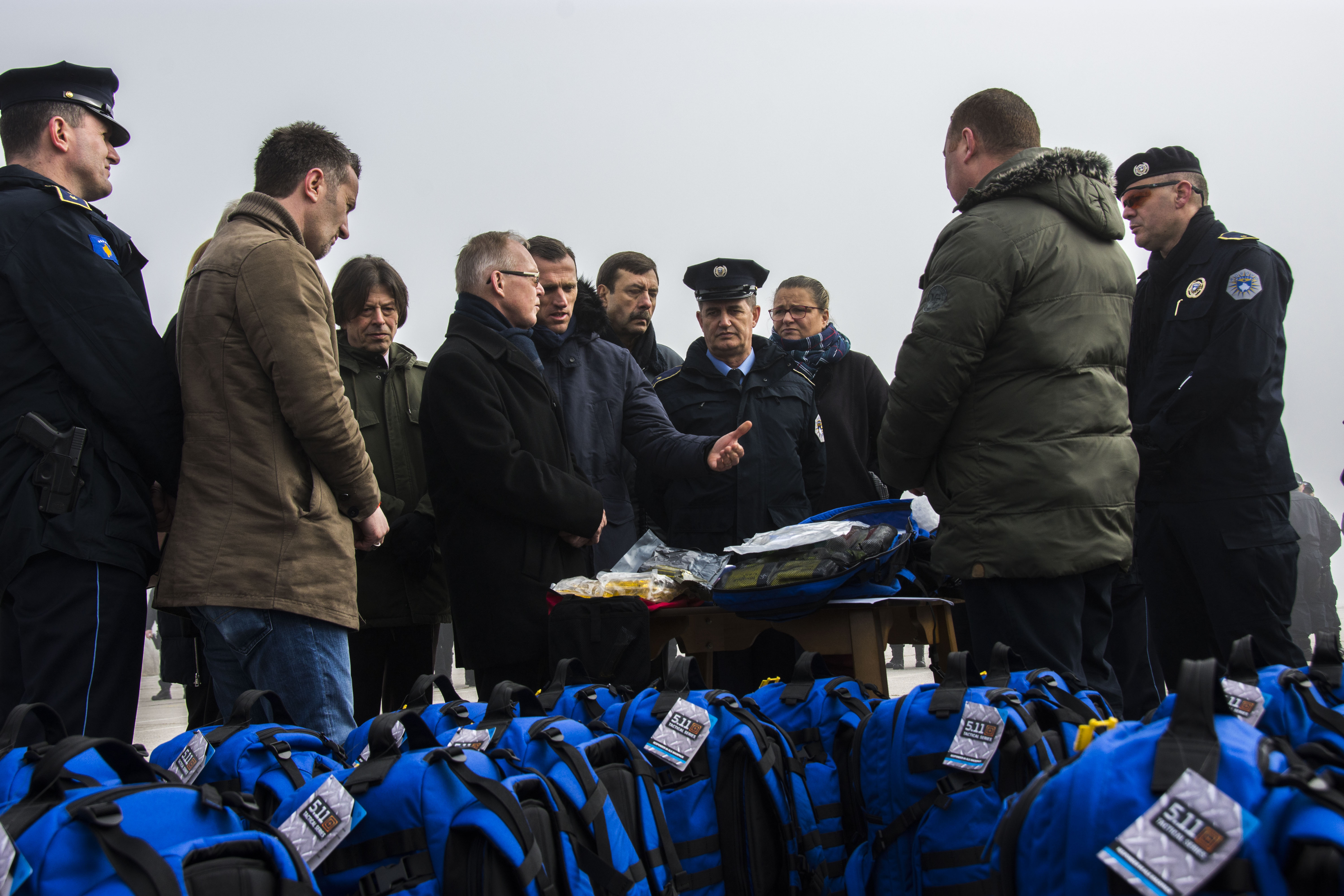 Shefi i Misionit të OSBE-së në Kosovë Jan Braathu në ceremoninë e dorëzim-pranimit të çantave të ndihmës së parë për njësitë operacione speciale dhe njësitë për reagim të shpejtë të Policisë së Kosovës, Kampi Vrella, Lipjan, 6 shkurt 2018.