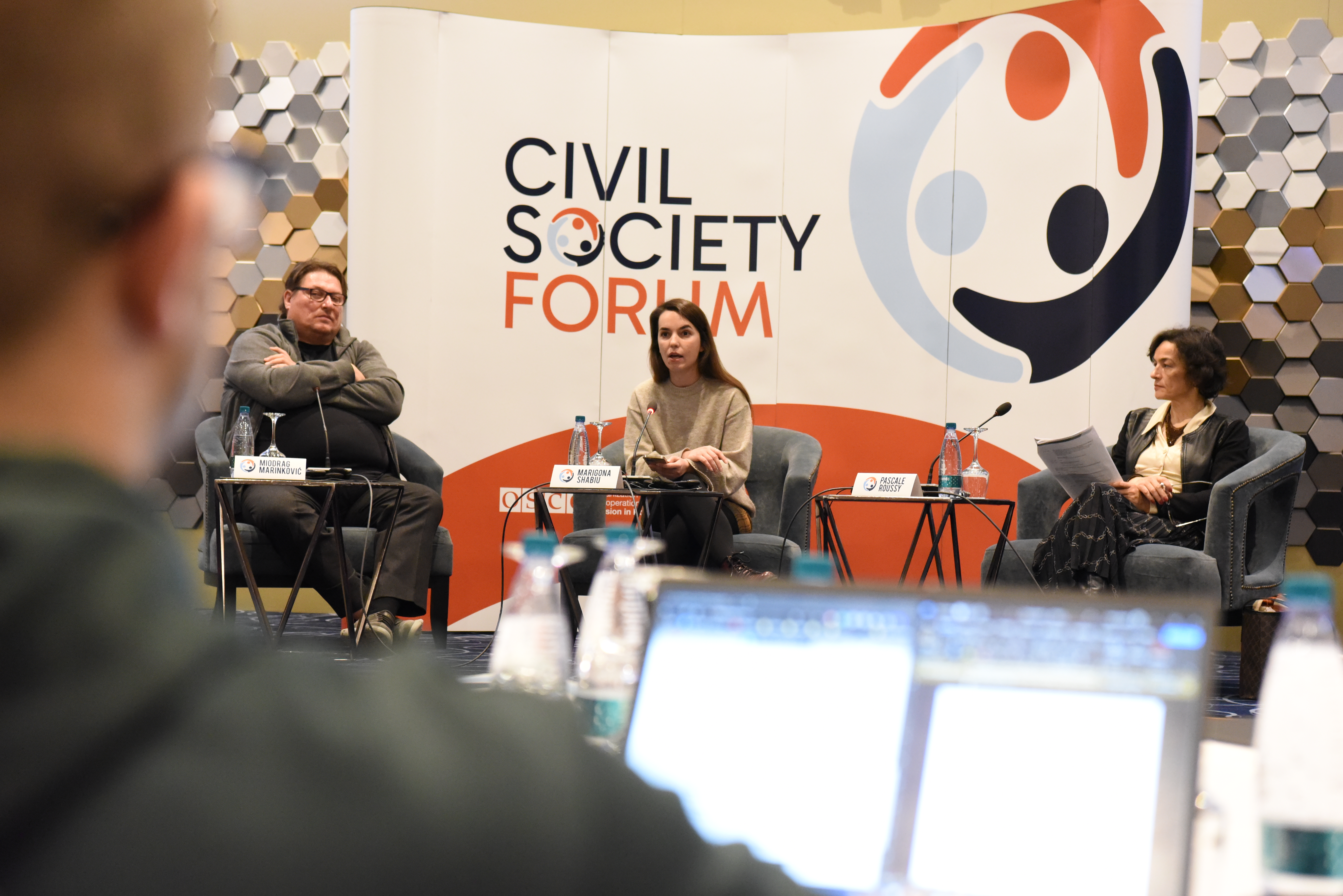 Miodrag Marinkoviq, Drejtor i Qendrës për Veprime Afirmative Sociale, Marigona Shabiu, Drejtoreshë Ekzekutive e Nismës Rinore për të Drejtat e Njeriut në Kosovë, dhe Pascale Roussy, Drejtoreshë e Departamentit për Demokratizim në OSBE, gjatë fjalimeve hyrëse në Forumin e 7-të të Shoqërisë Civile të organizuar nga Misioni i OSBE-së, Prishtinë, 13 dhjetor 2023