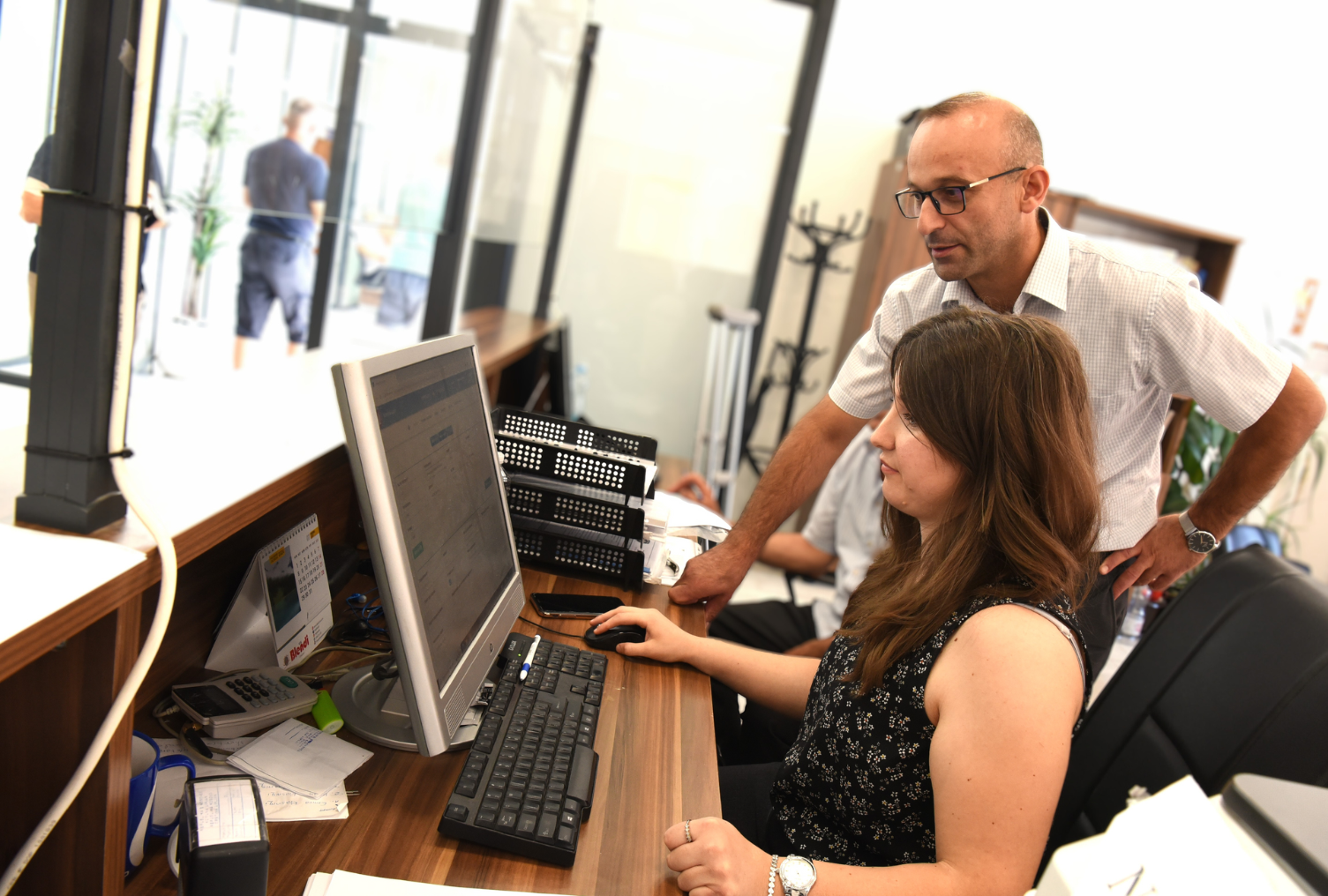 Malborë Qerimi duke i treguar një kërkesë Burim Gashit, Shef i Sektorit të Administratës së Përgjithshme në Komunën e Lipjanit.