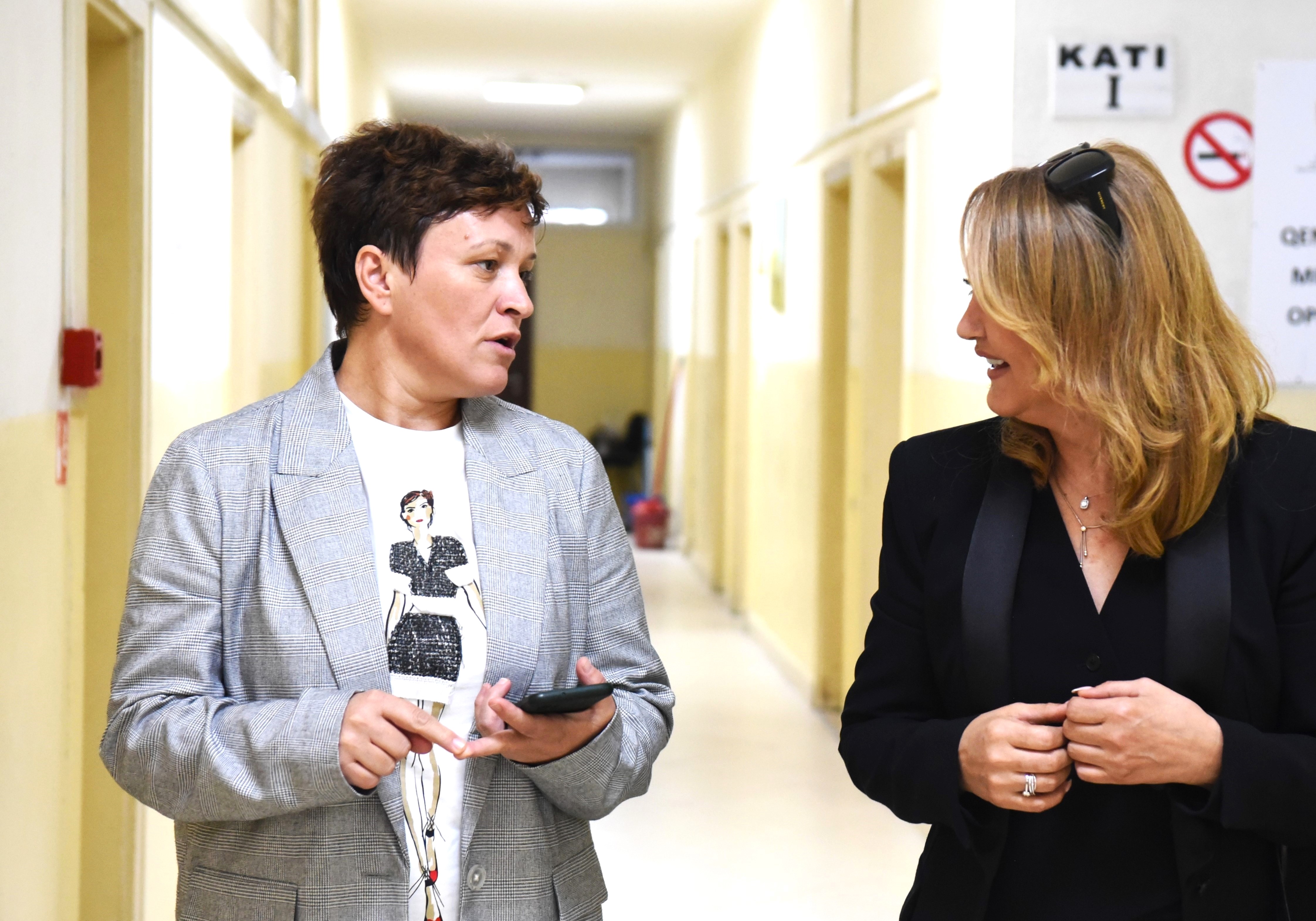 Dashurije Ahmeti (majtas), Shefe e Sektorit të të Rinjve në Komunën e Ferizajt, dhe Arijeta Rrotlla, Zyrtare për Çështje Pronësore në Misionin e OSBE-së në Kosovë, diskutojnë rreth temave të pronës e trashëgimisë, Ferizaj, 27 maj 2025.