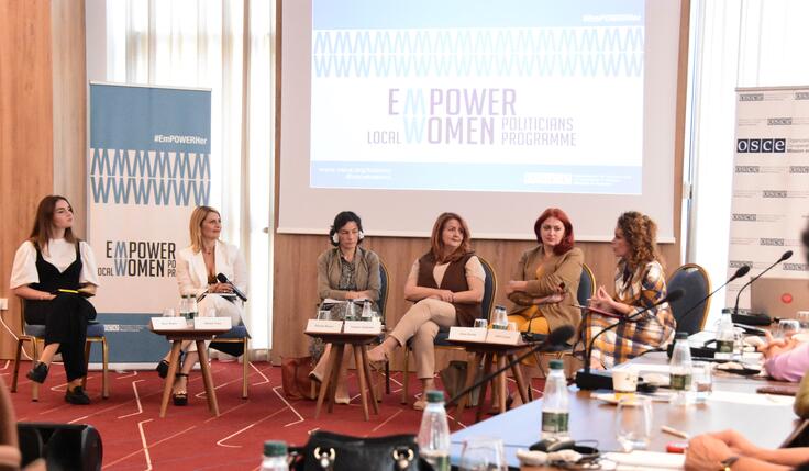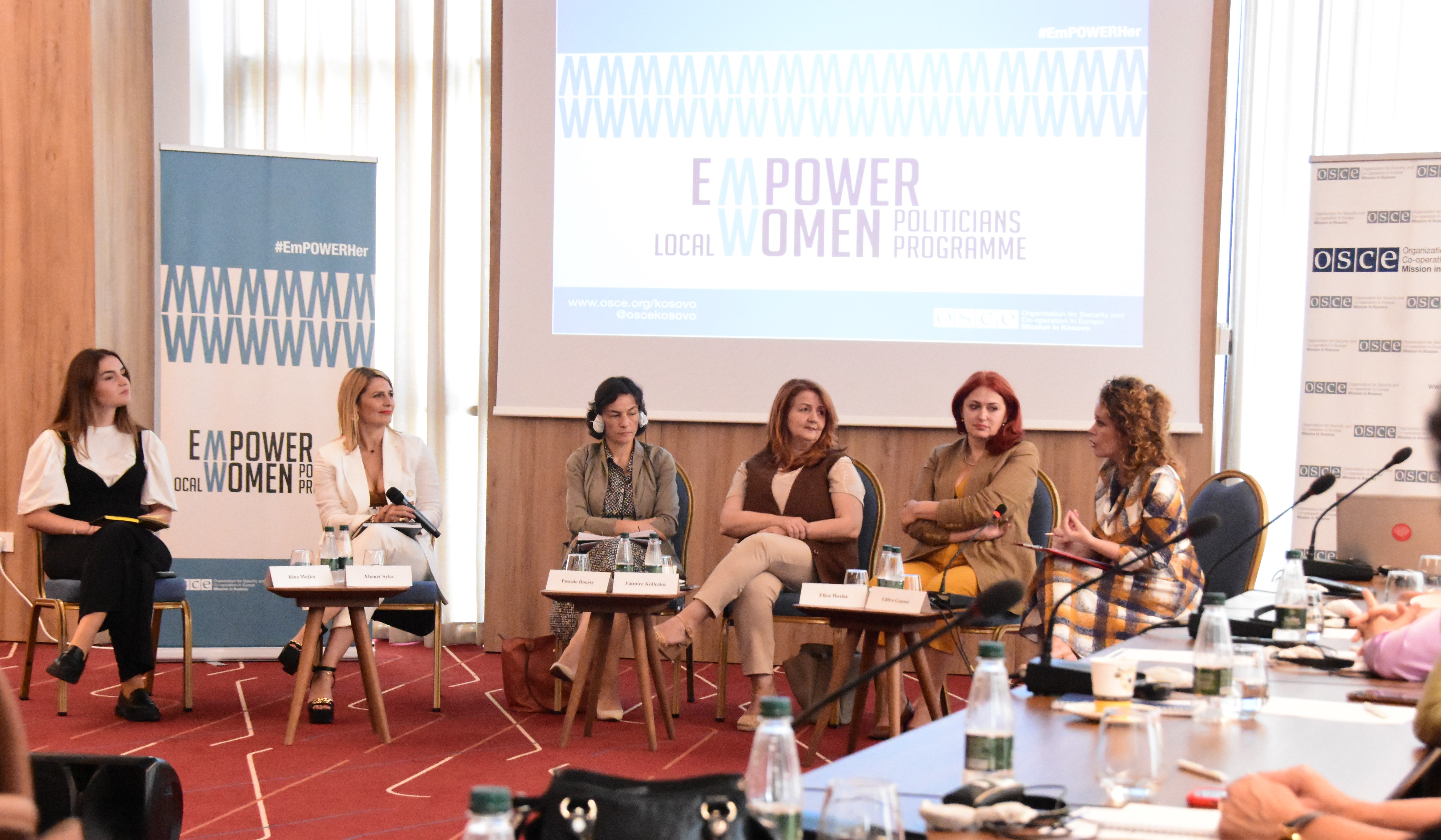 Trajnerja e EmPOWER Edlira Çepani, së bashku me deputete, zyrtare komunale dhe gazetare bisedojnë me pjesëmarrëset në kampin veror 2023 të EmPOWER. Istog, korrik 2023.