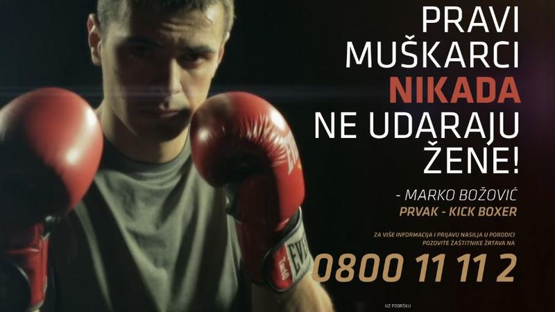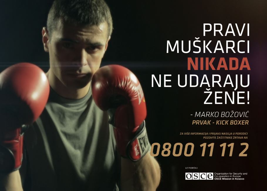 Poster u OEBS-ovoj kampanji protiv nasilja nad ženama. “Pravi muškarci nikada ne udaraju žene” je poruka koju je preneo šampion u kik-boksu Marko Božović.