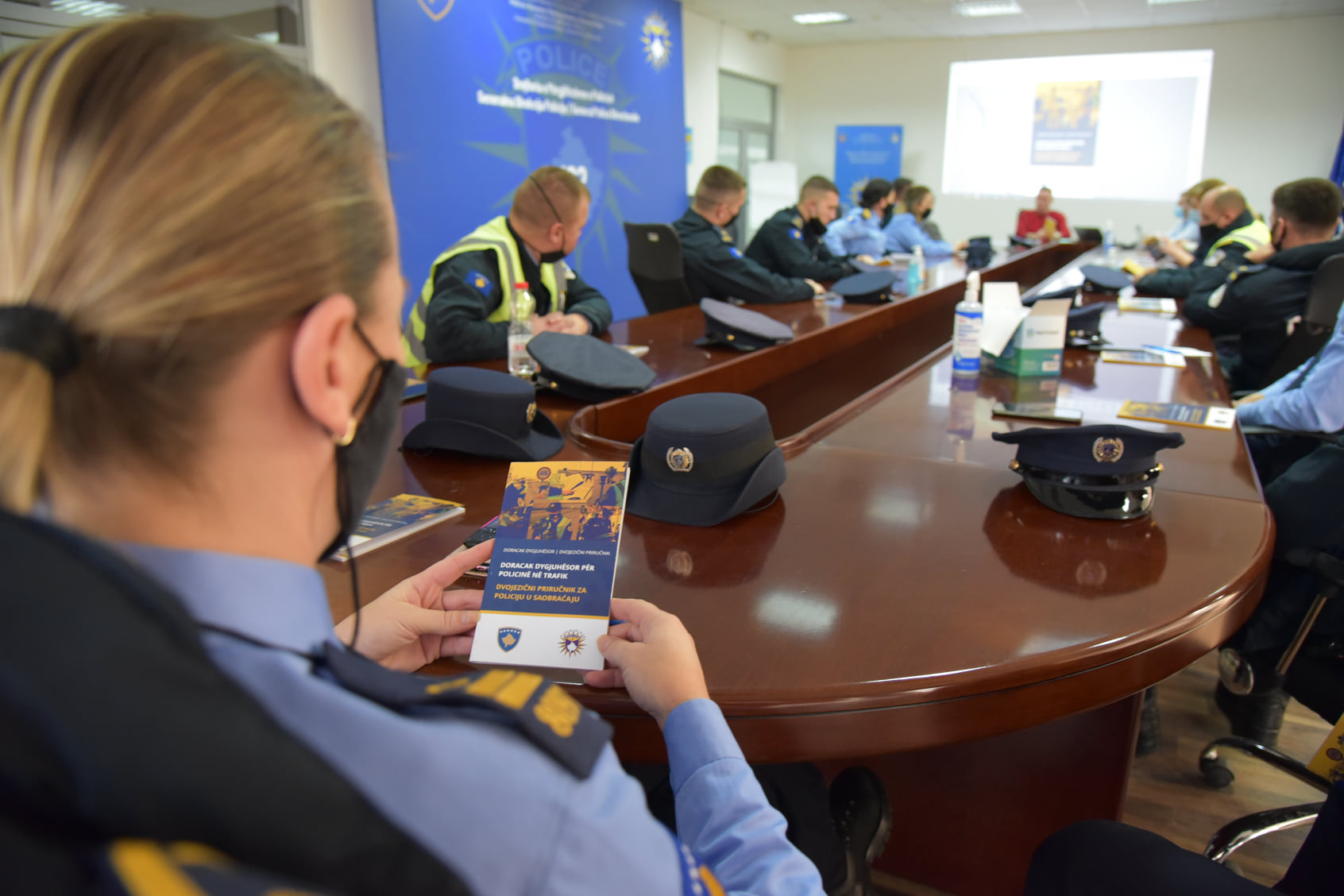 Zvaničnica Policije Kosova gleda dvojezični priručnik za saobraćajnu policiju koji je pripremljen uz pomoć́ Misije OEBS-a da bi se unapredila komunikacija između policijskih službenika i zajednica kojima služe, Priština, 14. februar 2022.