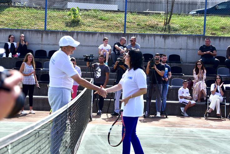 Šef Misije OEBS-a na Kosovu ambasador Majkl Davenport i predsednica opštine Gračanica Ljiljana Šubarić igraju prijateljski meč tokom četvrtog izdanja multietničkog teniskog kampa u Gračanici, 1. septembar 2023.