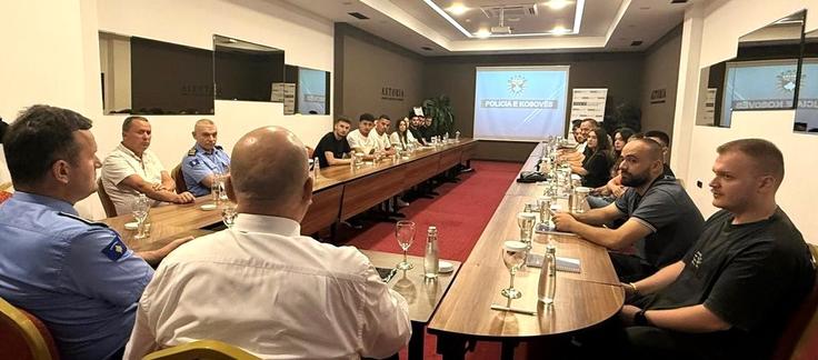 Kosovska policija u razgovoru sa mladima tokom jednog od događaja koje je podržala Misija sa ciljem da ih podstakne da se prijave i pridruže njihovim redovima. Gnjilane, 1. jul 2025.