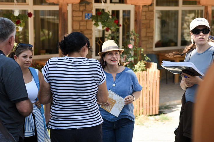 Ekspertkinja za kulturno nasleđe Marselja Pljiku Demaj organizuje studente u timove, dodeljujući im specifične uloge i lokacije za njihovo istraživanje. 19. avgust 2025 (OEBS/Leurina Mehmeti).