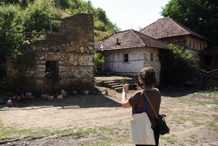 Studentkinja beleži arhitektonske detalje seoske kuće kroz fotografiju kao deo procesa dokumentovanja. 19. avgust 2025 (OEBS/Leurina Mehmeti).