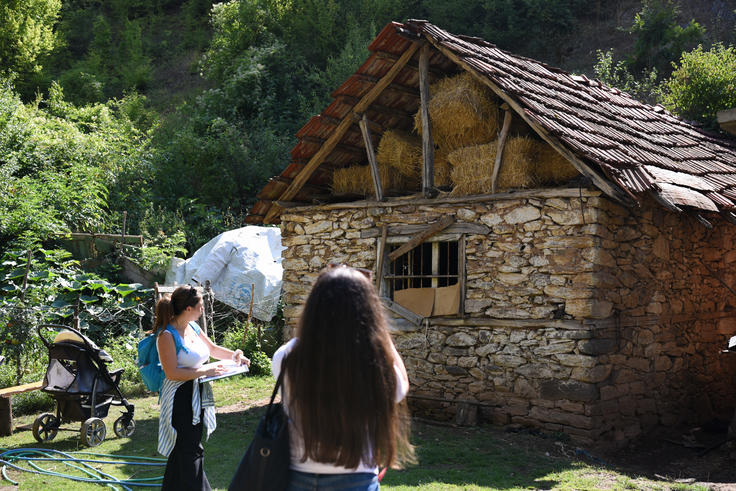 Dve studentkinje pažljivo posmatraju i dokumentuju tradicionalnu seosku kuću, doprinoseći očuvanju narodne arhitekture. 19. avgust 2025 (OEBS/Leurina Mehmeti).
