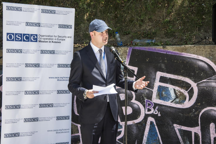 Christopher Tuetsch, the OSCE Mission in Kosovo Director of Democratization Department, welcomes young basketball players from all over Kosovo to the tournament. Later he said: “When they first arrived, they were a bit reserved. But as they practiced and spent time together, they got closer. It was amazing to see them work hard and play together in ethnically mixed teams in the semi-final and final games. That was ultimately our goal.”